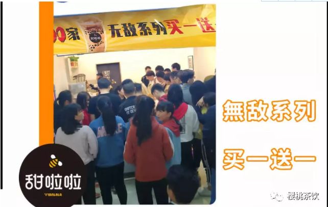 越是低線城市,現(xiàn)制茶飲門店人均消費(fèi)也就越低,2018年全國飲品門店人均消費(fèi)價(jià)格三四線城市分別為13元、12元,低線城市的價(jià)格接受度、消費(fèi)文化的現(xiàn)狀,都成為門店不得不面對(duì)的挑戰(zhàn)。低價(jià)而又高價(jià)值感的飲品成為三四線消費(fèi)者歡迎的產(chǎn)品,甜啦啦非常清楚這一點(diǎn),立足于年輕人、學(xué)生群體的口味和消費(fèi)能力,以更低的價(jià)格、更高的性價(jià)比占領(lǐng)中低端的消費(fèi)市場。并在上新時(shí)同步上線買一送一活動(dòng),吸引現(xiàn)場排起長隊(duì)。